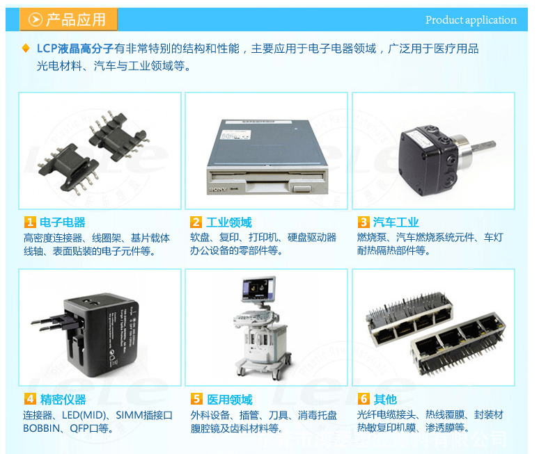 B、LCP:印刷电路板、人造卫星电子部件、喷气发动机零件、汽车机械零件