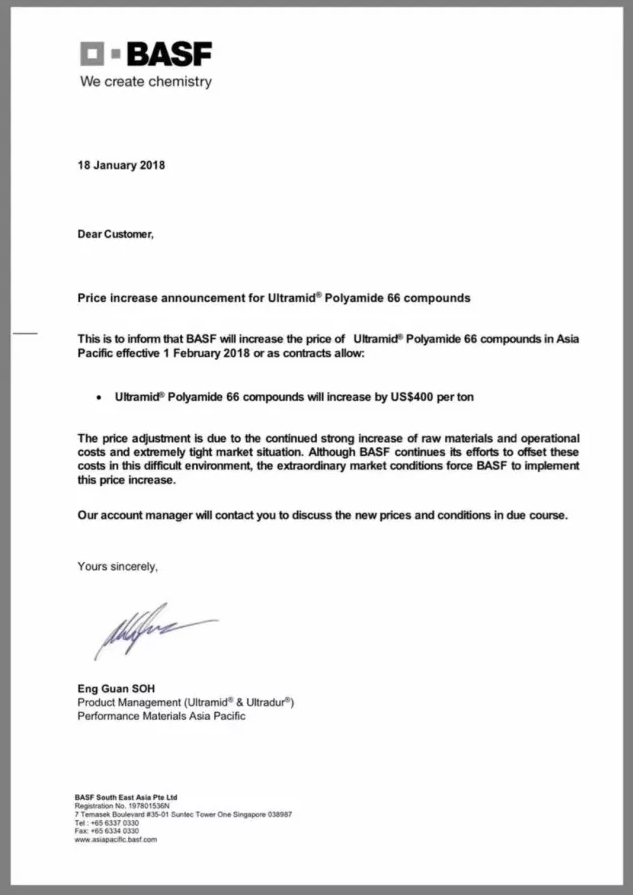 2018年1月18日,巴斯夫宣布,2月1日起,上调PA66产品价格,幅度为400美元/吨,折合人民币2560元/吨!