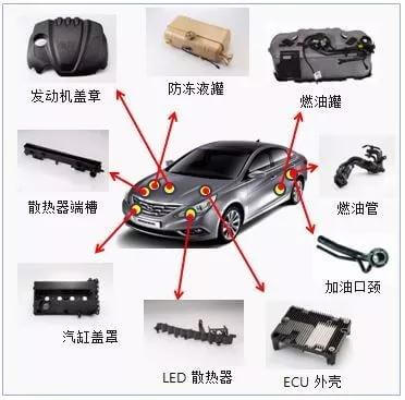 汽车:(轻,高刚性,耐热,耐油耐冲击性)水箱盖,油槽,保险杆,门把