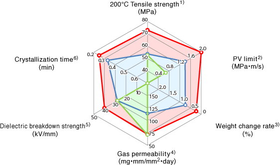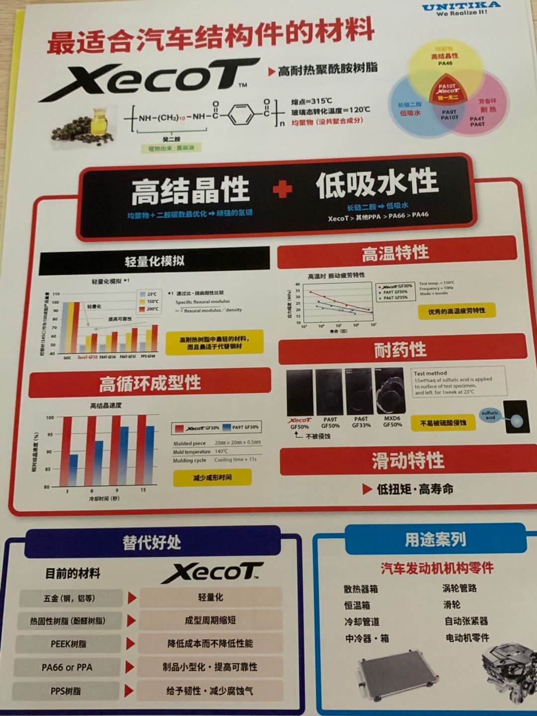 由于Unitika特殊的高聚合技术,“XecoT”比其他结晶树脂具有高熔点(Tm)、高结晶度等优异性能。与聚苯硫醚、芳香族尼龙等其它高热结晶树脂相比,具有明显的优点,具有良好的耐回流热性能和高温力学性能。