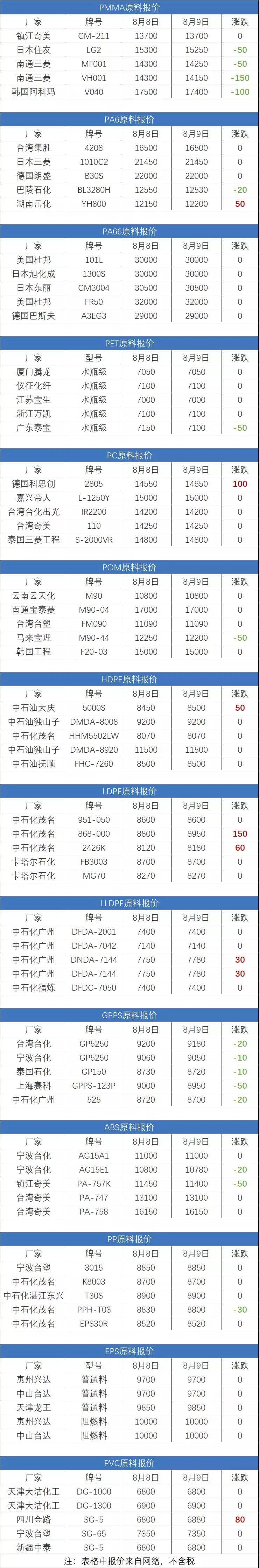2019年8月9日塑胶原料报价