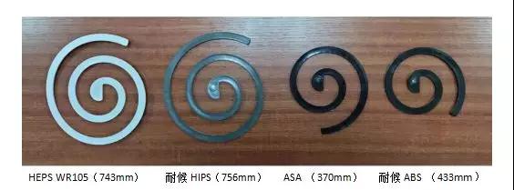 当然,加工性能也是很重要的,HEPS的流动性远高于ABS和ASA,接近于HIPS。我们用同样条件下注塑样条比较样条长度,可以对比不同材料的加工流动性能: