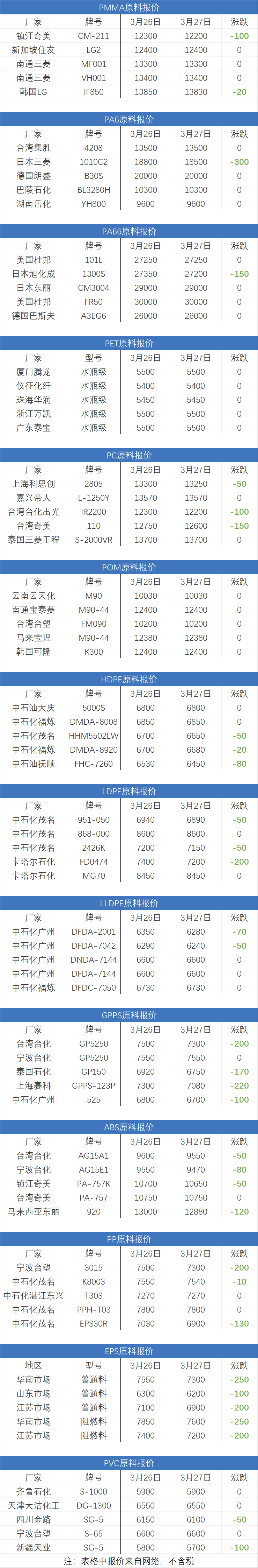 ABS塑胶原料:ABS成交价格继续走低,外围原油低位运行,欧美受公共卫生事件爆发带来的需求下降,导致国内纯苯、苯乙烯暴跌,ABS成本支撑塌陷,市场恐慌情绪蔓延,贸易商买涨不买跌心态,市场成交乏力,预计ABS价格继续下跌为主,华南地区主流价格参考在9650-10500元/吨左右。(未含税)