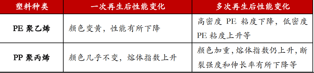 此外,再生塑料在保证经济性的前提下较难保持良好的卫生性能。因此,再生塑料适用于循环次数不多,且对卫生性能要求不高的领域。
