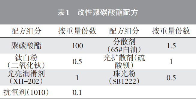 聚碳酸酯树脂的熔融指数为5~8 g/10 min;光扩散剂为经1 000 目筛选后的硫酸钡;光粉为经1 500 目筛选后的银白色SB1222 号珠光粉。其中钛白粉的作用是为了颜色均匀化,防止产生色差。
