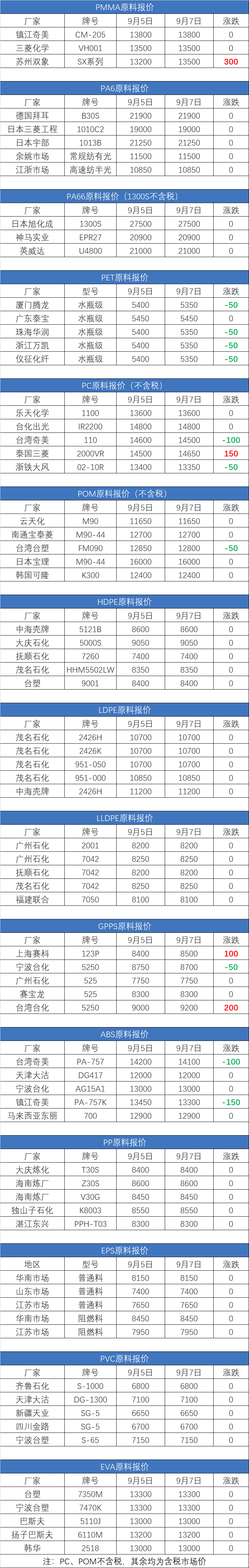 EPS塑胶原料:装置方面,延川壬庚计划近日试产,大庆锡达8月30日停车检修,9月4日投料重启,上周EPS市场整体稳定,个别探涨,苯乙烯小幅走高,终端需求暂未有明显转好,部分货源仍紧,整体成交维持刚需,预计近日EPS市场或窄盘整理,预计下周EPS市场走势或维持窄盘整理,华南地区普通料市场价格参考在8000-8100元/吨。(未含税)