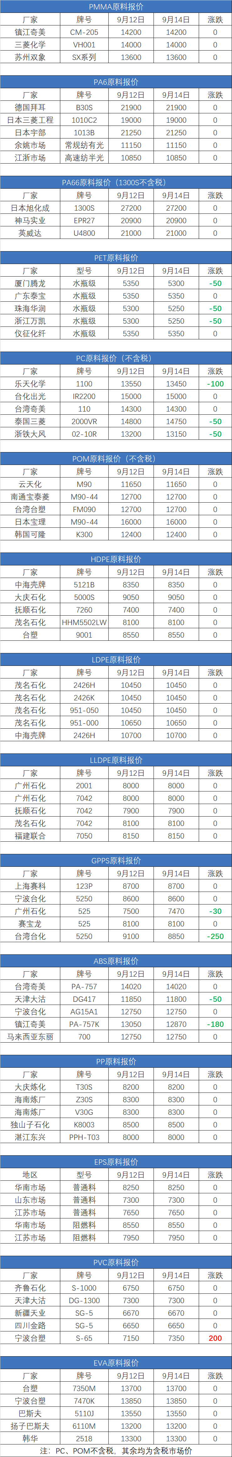 ABS塑胶原料:上周国内ABS市场价格全线下跌,上海高桥20万吨/年装置开工9成,山东海江20万吨/年装置负荷6-7成,苯乙烯交投有限,成本端支撑一般,周五中油华南出货不佳,挂牌价格下调300-400元/吨,市场跟跌,场内气氛略显悲观,预计本周ABS市场价格维持窄幅整理为主,华南地区宁波台化15A1主流市场价格参考在12750元/吨左右。(未含税)