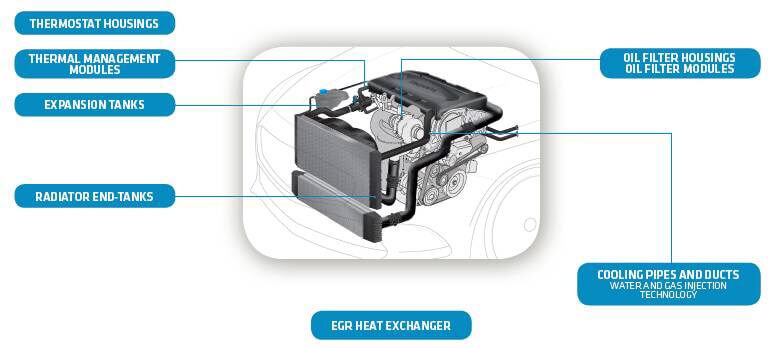 Technyl®Blue是在Technyl 34NG系列材料成功应用的基础上开发的,相比一般尼龙66(PA66),耐水解性能提高了15% - 60%。该复合材料在低温环境下具备抗路盐腐蚀性,可直接应用于汽车散热器、机油滤清器外壳/模块以及废气再循环(EGR)系统的热交换器等领域。